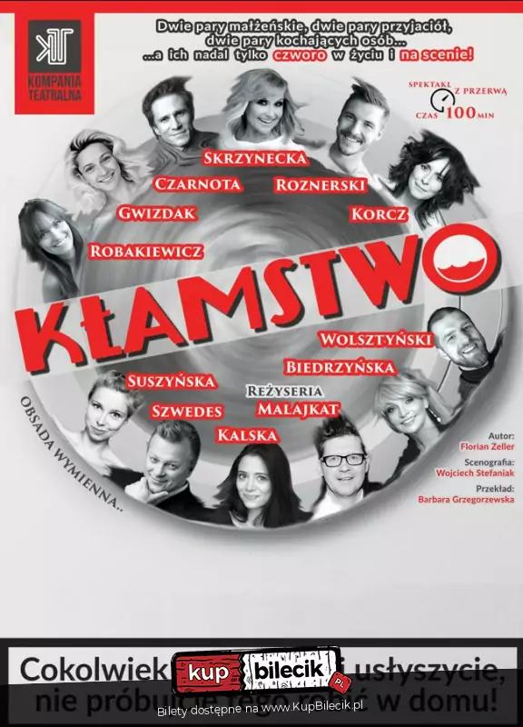 Dwie pary małżeńskie, dwie pary przyjaciół, dwie pary kochanków, a ich nadal tylko czworo, jak to jest możliwe? Wszystkiego dowiecie się Państwo podczas spektaklu "Kłamstwo"! Francuski autor Florian Zeller spróbował kłamstwo zweryfikować w warunkach scenicznych. Udało mu się to na tyle,że w całej Europie widzowie podczas przedstawień spadają z krzeseł z rozbawienia, za chwilę wracają na miejsca dyskretnie zerkając wokół i szukając wsparcia i zrozumienia u innych kobiet i mężczyzn. Niech to uświadomi siłę rażenia tego tekstu. Reżyser przedstawienia, Wojciech Malajkat, zdradza: "Przeraża nas to, jak można wygodnie żyć w związku, jednocześnie nie wiedząc nic o sobie nawzajem".